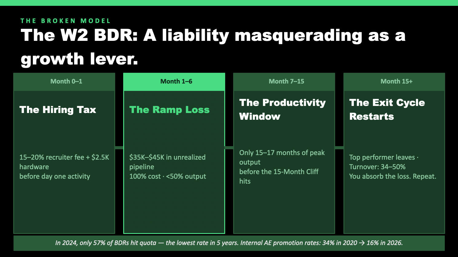 The average sales rep costs $145K fully loaded and hits quota only 57% of the time.Every week without outbound is pipeline you're not building. Vorota can be running sequences, booking meetings, and filling your CRM within 14 days of kickoff.